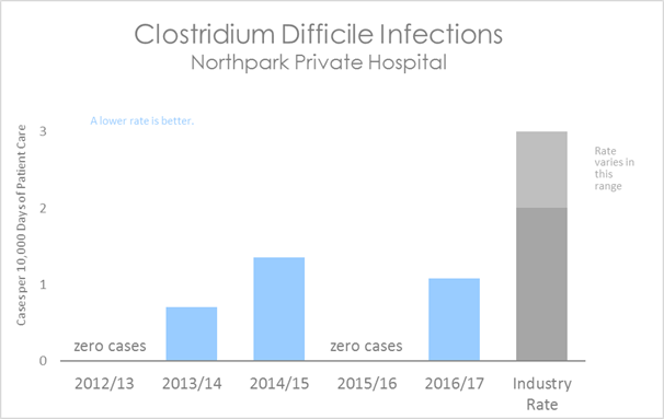This graph shows that the number of Clostridium Difficile infections at Northpark Private Hospital is very low and lies well below the industry rate.