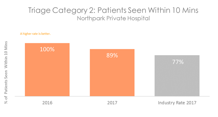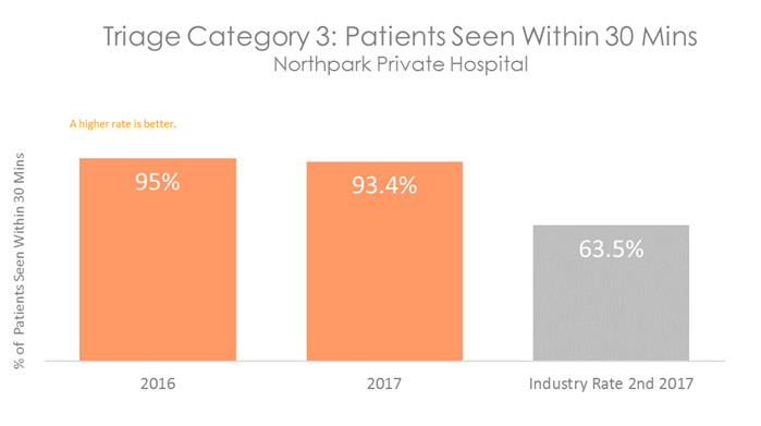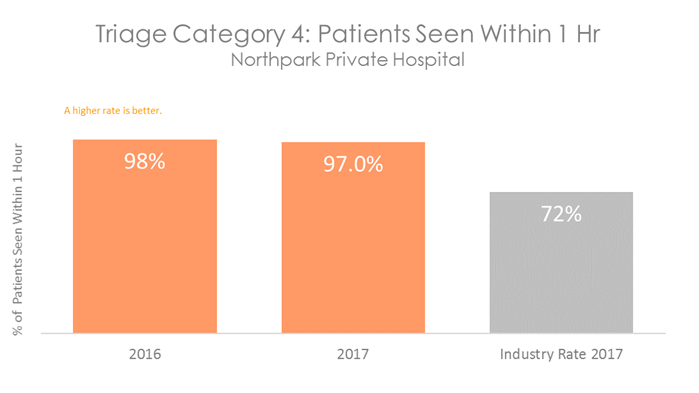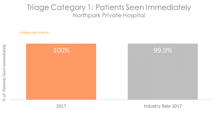 Patients who are in categories 1, 2 or 3 will be seen before categories 4 and 5, even if they arrive in the department at a later time. All hospitals with Emergency Departments measure how quickly patients are attended to. The graphs below show the percentage of patients in each category who are seen within the recommended time. They show that on average, patients visiting the Emergency Department at Northpark Private Hospital are attended to more quickly than patients in other Australian hospitals.