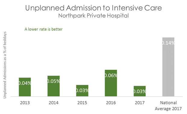 This graph shows that patients admitted to Northpark Private Hospital are less likely to have an unplanned admission to Intensive Care compared with patients in other Australian hospitals.