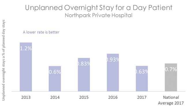 The graph below shows the percentage of day patients who have required an unplanned overnight stay or transfer to another hospital. The coloured bars represent Northpark Private Hospital's rate. This is compared to the rate of unplanned overnight stays in other Australian hospitals, shown in the grey bar.