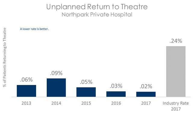 This graph shows that patients undergoing surgery at Northpark Private Hospital are less likely to have an unplanned return to theatre compared with patients in other Australian hospitals.
