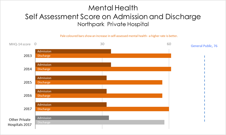 This graph shows that patients feel that their mental health has improved after treatment. Patients at Northpark Private Hospital achieve improvement similar to patients at other Australian private mental health facilities.