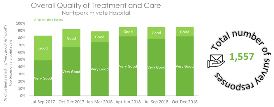This graph shows that patients’ rating of treatment and care at Northpark Private Hospital has been improving, especially the ‘very good’ ratings. Since late 2017, the combined 'good' and 'very good' ratings have been consistently at or above 89%. [Data correct as 23 January 2019.]