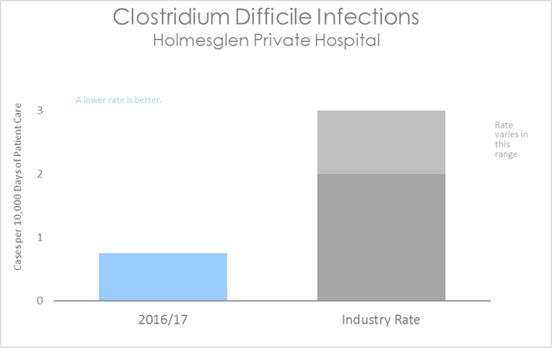 This graph shows that the number of Clostridium Difficile infections at Holmesglen Private Hospital is very low and lies well below the industry rate.