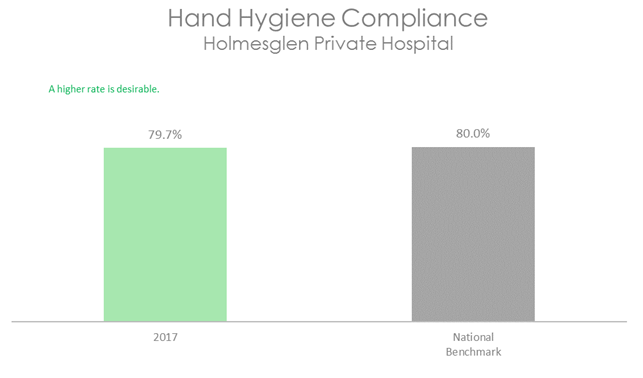 This graph shows that hand hygiene compliance at Holmesglen Private Hospital is very close to the national benchmark.