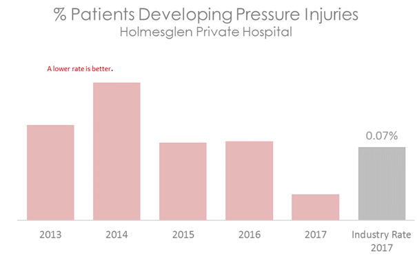 The graph below shows the number of patients who have developed a pressure injury during their admission to hospital. The coloured bars represent Holmesglen Private Hospital's rate. This is compared to the rate of pressure injuries in other Australian hospitals, shown in the grey bar.