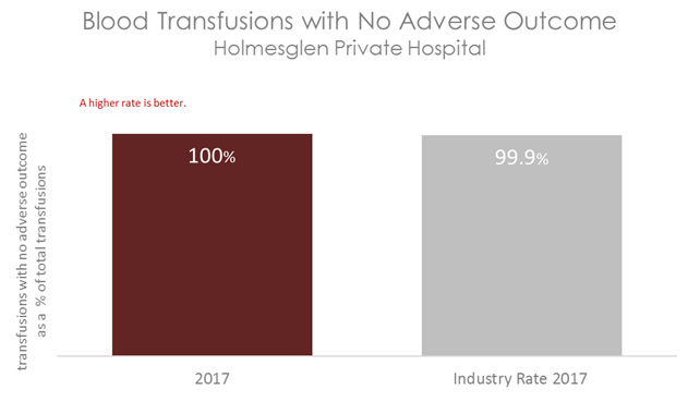 The graph below shows the number of patients who had a transfusion with no significant adverse event. The coloured bars represent Holmesglen Private Hospital's rate. This is compared to the rate of successful transfusion events in other Australian hospitals, shown in the grey bar.