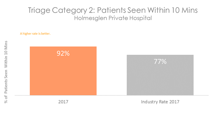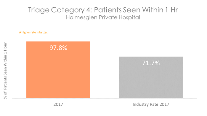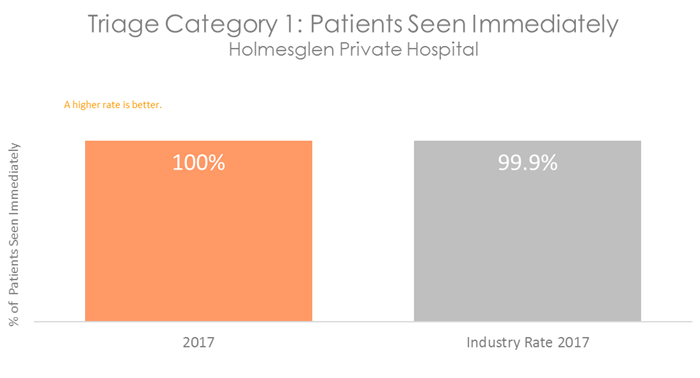 Patients who are in categories 1, 2 or 3 will be seen before categories 4 and 5, even if they arrive in the department at a later time. All hospitals with Emergency Departments measure how quickly patients are attended to. The graphs below show the percentage of patients in each category who are seen within the recommended time. They show that on average, patients visiting the Emergency Department at Holmesglen Private Hospital are attended to more quickly than patients in other Australian hospitals.