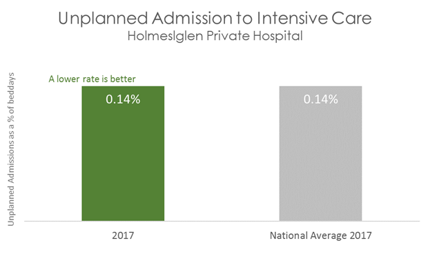 This graph shows that in 2017, patients admitted to Holmesglen Private Hospital were as likely to have an unplanned admission to Intensive Care as patients in other Australian hospitals.