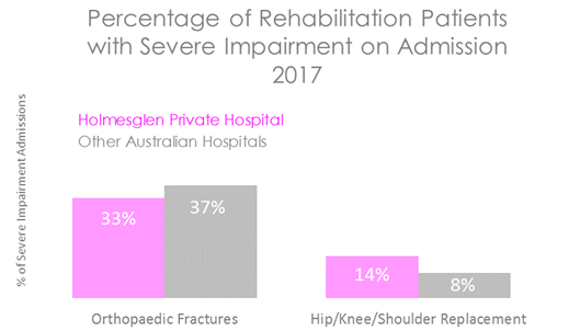 The chart below shows the percentage of patients with a severe impairment on admission. The coloured bars represent Holmesglen Private Hospital's rate. This is compared to the rate in other Australian hospitals, shown in the grey bar.