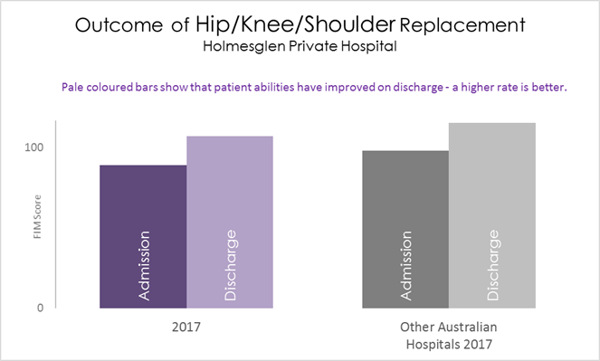 The graph below shows the improvement in patients after rehabilitation for a joint replacement. The dark coloured bars represent patients' abilities on admission to Holmesglen Private Hospital. The pale coloured bars represent patients' abilities on discharge. This is compared to the outcomes at other Australian hospitals, shown in the grey bars.