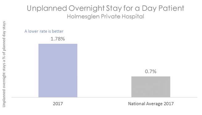 The graph below shows the percentage of day patients who have required an unplanned overnight stay or transfer to another hospital. The coloured bars represent Holmesglen Private Hospital's rate. This is compared to the rate of unplanned overnight stays in other Australian hospitals, shown in the grey bar.