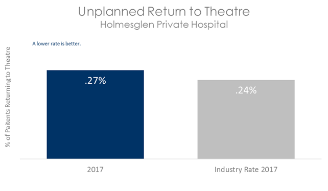 This graph shows that in 2017, patients undergoing surgery at Holmesglen Private Hospital were slightly more likely to have an unplanned return to theatre compared with patients in other Australian hospitals.
