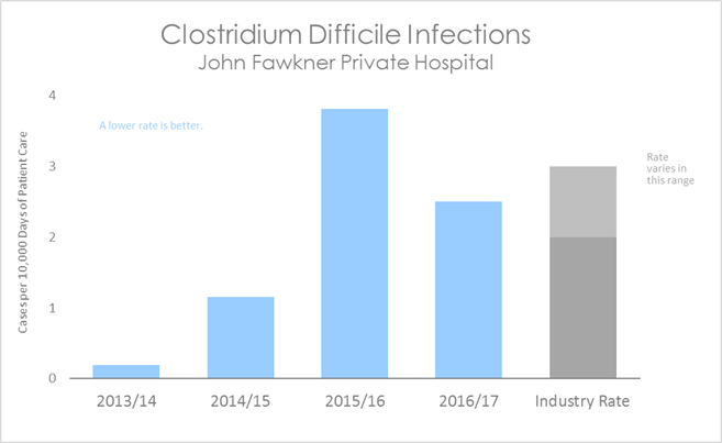 The graph below shows the number of Clostridium Difficile infections. The coloured bars represent John Fawkner Private Hospital's rate. This is compared to the rate in other Australian hospitals, shown in the grey bar. The industry rate varies from 2 to 3 cases per 10,000 days of patient care.