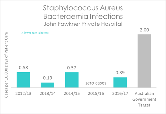 This graph shows that the Staphylococcus Aureus Bacteraemia infection rates at John Fawkner Private Hospital are well below the national benchmark.