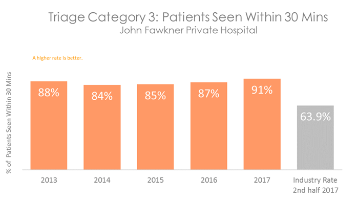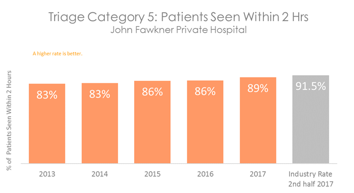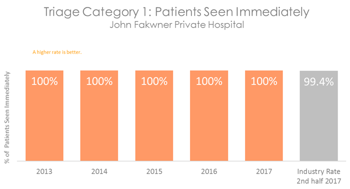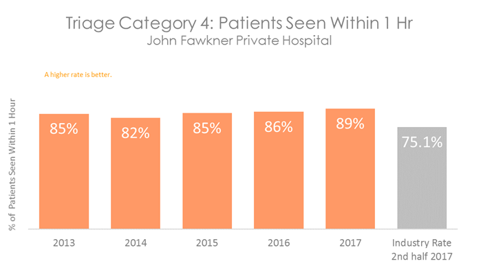 Patients who are in categories 1, 2 and 3 will be seen before categories 4 and 5, even if they arrive in the department at a later time. All hospitals with Emergency Departments measure how quickly patients are seen. The graphs below show the percentage of patients in each category who are seen within the recommended time. They show that on average, patients visiting the Emergency Department at John Fawkner Private Hospital are seen more quickly than patients in other Australian hospitals.