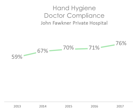 This graph shows that staff at John Fawkner Private Hospital on average have a high rate of compliance with hand hygiene.