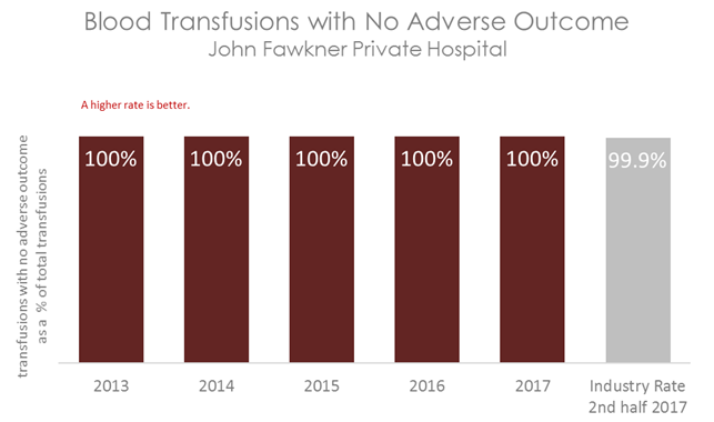 This graph shows that patients at John Fawkner Private Hospital are less likely to have an adverse transfusion event compared with patients in other Australian hospitals