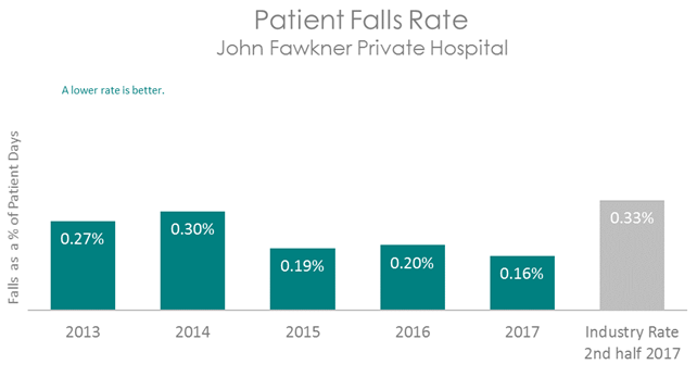 This graph shows that patients at John Fawkner Private Hospital on average have a lower rate of falls than patients in other Australian hospitals.