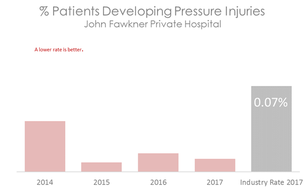 This graph shows that patients at John Fawkner Private Hospital are less likely to develop a pressure injury compared with patients in other Australian hospitals.