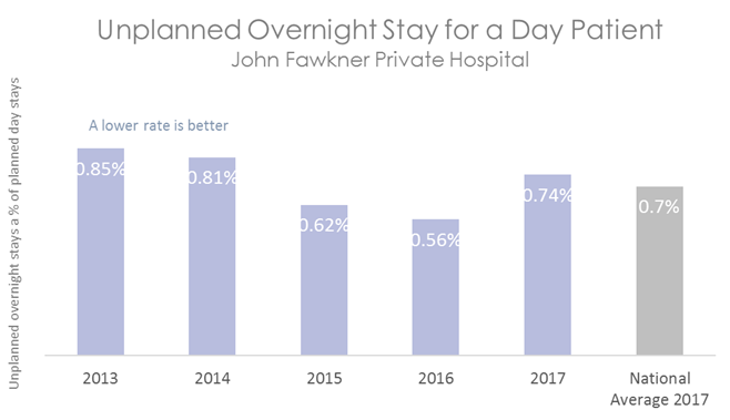 The graph below shows the percentage of day patients who have required an unplanned overnight stay or transfer to another hospital. The coloured bars represent John Fawkner Private Hospital's rate. This is compared to the rate of unplanned overnight stays in other Australian hospitals, shown in the grey bar.