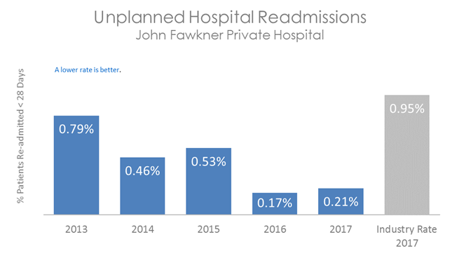 The graph below shows the percentage of patients who have required an unplanned readmission to hospital within 28 days of their first admission. The coloured bars represent John Fawkner Coast Private Hospital's rate. This is compared to the rate of unplanned readmission in other Australian hospitals, shown in the grey bar.