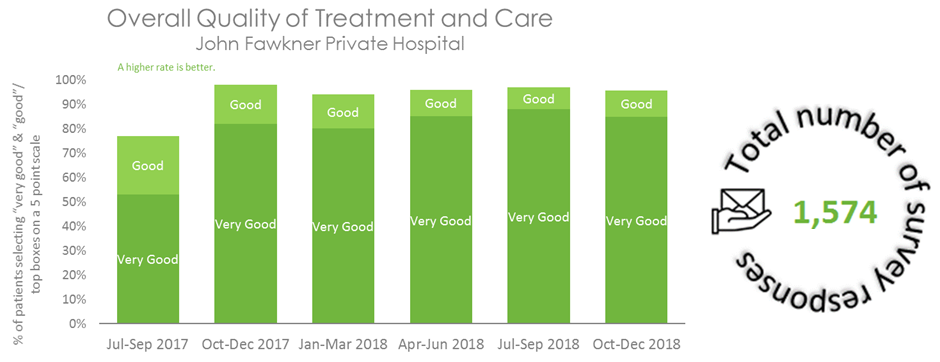 This graph shows that patients’ rating of treatment and care at John Fawkner Private Hospital has been improving, especially the ‘very good’ ratings. Since late 2017, combined 'good' and 'very good' ratings have been consistently above 90%. [Data correct as at 23 January 2019.]