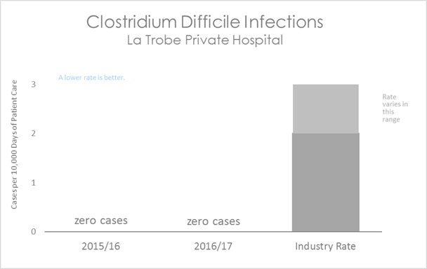 This graph shows that there have been no cases of Clostridium Difficile infections at LaTrobe Private Hospital in recent years.