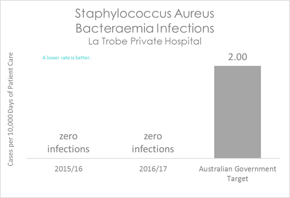 The graph below shows the number of Staphylococcus Aureus infections at LaTrobe Private Hospital. The coloured bars represent LaTrobe Private Hospital's rate. This is compared to the Australian Government target, shown in the grey bar. The national benchmark for SAB is no more than 2 cases per 10,000 days of patient care.