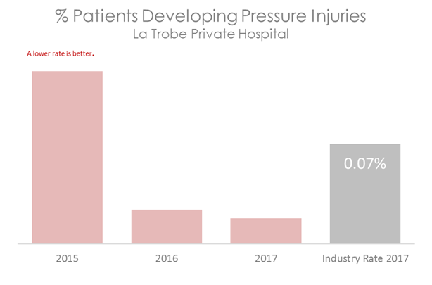 The graph below shows the number of patients who have developed a pressure injury during their admission to hospital. The coloured bars represent LaTrobe Private Hospital's rate. This is compared to the rate of pressure injuries in other Australian hospitals, shown in the grey bar.