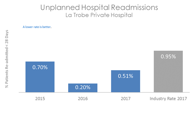 The graph below shows the percentage of patients who have required an unplanned readmission to hospital within 28 days of their first admission. The coloured bars represent LaTrobe Private Hospital's rate. This is compared to the rate of unplanned readmission in other Australian hospitals, shown in the grey bar.