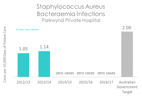 The graph below shows the number of Staphylococcus Aureus infections. The coloured bars represent Parkwynd Private Hospital's rate. This is compared to the Australian Government target, shown in the grey bar. The national benchmark for SAB is no more than 2 cases per 10,000 days of patient care.