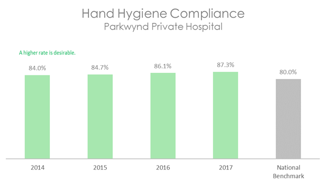 This graph shows that hand hygiene compliance at Parkwynd Private Hospital lies well above the national benchmark.