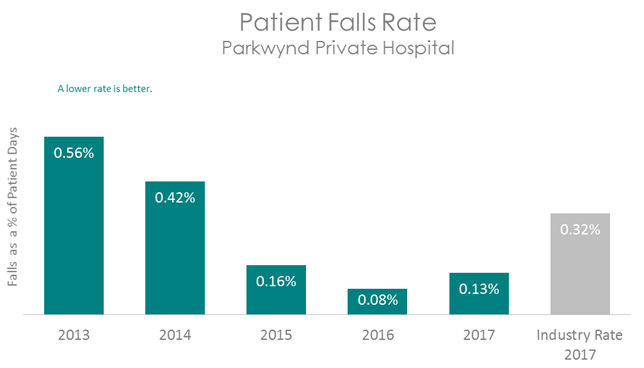 This graph shows that in recent years, patients at Parkwynd Private Hospital have had a lower rate of falls than patients in other Australian hospitals.