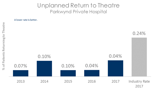 The graph below shows the percentage of patients who have required a return to theatre after having an operation at Parkwynd Private Hospital. The coloured bars represent Parkwynd Private Hospital's rate. This is compared to the rate of return to theatre in other Australian hospitals, shown in the grey bar.