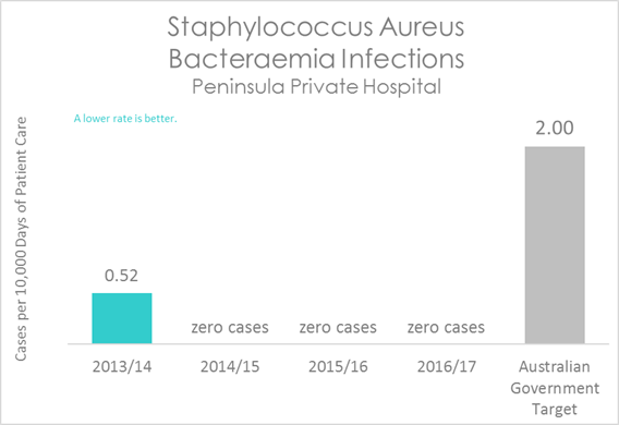 The graph below shows the number of Staphylococcus Aureus infections. The coloured bars represent Peninsula Private Hospital's rate. This is compared to the Australian Government target, shown in the grey bar. The national benchmark for SAB is no more than 2 cases per 10,000 days of patient care.