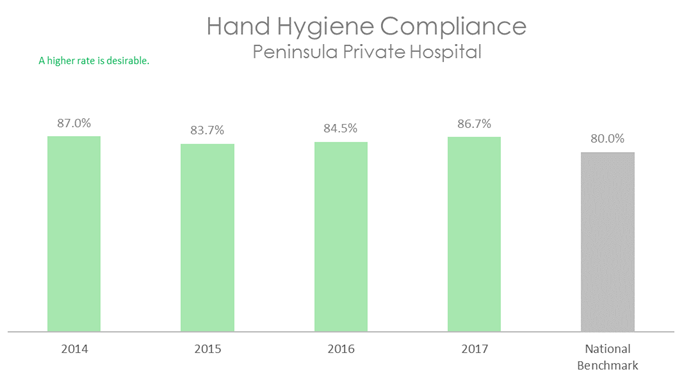 This graph shows that hand hygiene compliance at Peninsula Private Hospital lies well above the national benchmark.