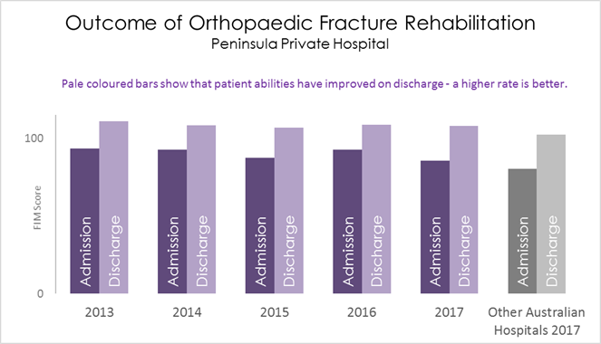 This graph shows that rehabilitation patients with bone fractures have higher scores on both admission and discharge at Peninsula Private Hospital than patients in other Australian hospitals. This is to be expected as the average patient has less severe impairments on admission than at other hospitals.