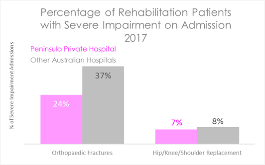 This chart shows that fewer patients at Peninsula Private Hospital have severe impairments on admission than in other Australian hospitals.