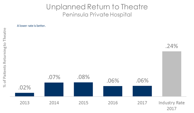 The graph below shows the percentage of patients who have required a return to theatre after having an operation at Peninsula Private Hospital. The coloured bars represent Peninsula Private Hospital's rate. This is compared to the rate of return to theatre in other Australian hospitals, shown in the grey bar.