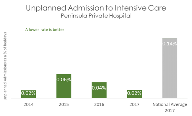 This graph shows that patients admitted to Peninsula Private Hospital are less likely to have an unplanned admission to Intensive Care compared with patients in other Australian hospitals.