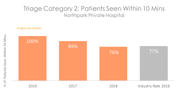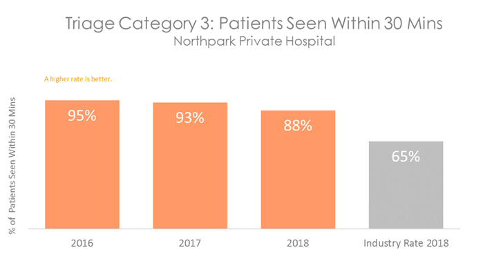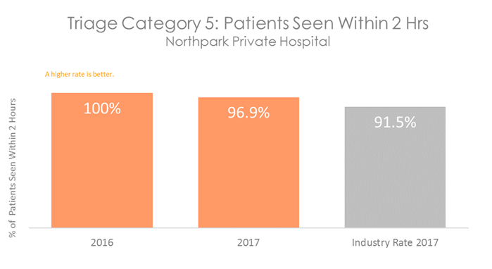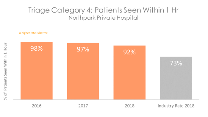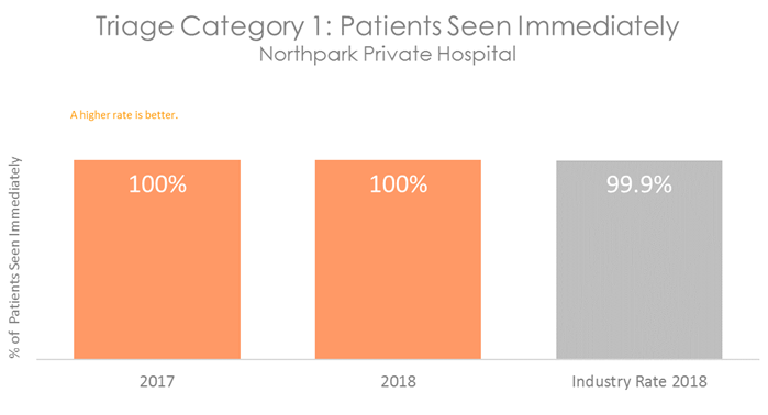 Patients who are in categories 1, 2 or 3 will be seen before categories 4 and 5, even if they arrive in the department at a later time. All hospitals with Emergency Departments measure how quickly patients are attended to. The graphs below show the percentage of patients in each category who are seen within the recommended time. They show that on average, patients visiting the Emergency Department at Northpark Private Hospital are attended to more quickly than patients in other Australian hospitals.