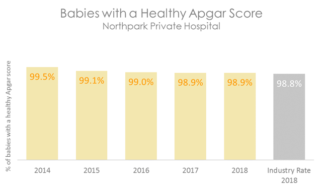 The graph below shows the percentage of babies who have a healthy Apgar score at five minutes after birth. The coloured bars represent Northpark Private Hospital's rate. This is compared to the rate at other Australian hospitals, shown in the grey bar.