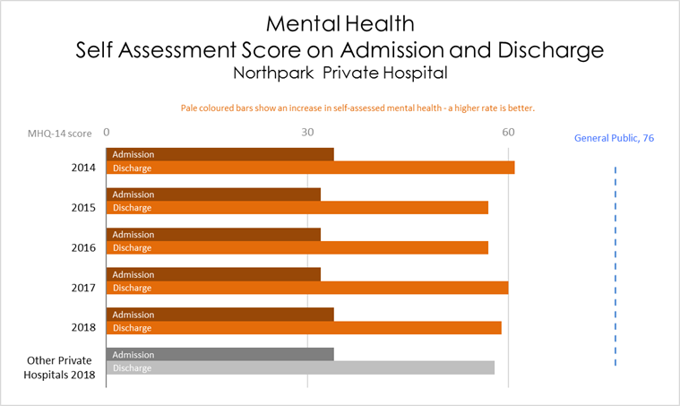 This graph shows that patients feel that their mental health has improved after treatment. Patients at Northpark Private Hospital achieve improvement similar to patients at other Australian private mental health facilities.