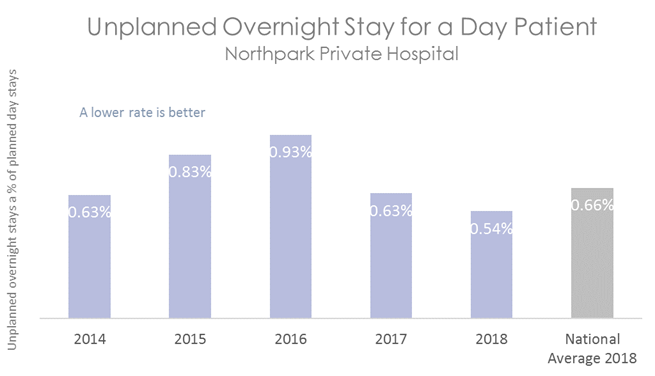 The graph below shows the percentage of day patients who have required an unplanned overnight stay or transfer to another hospital. The coloured bars represent Northpark Private Hospital's rate. This is compared to the rate of unplanned overnight stays in other Australian hospitals, shown in the grey bar.