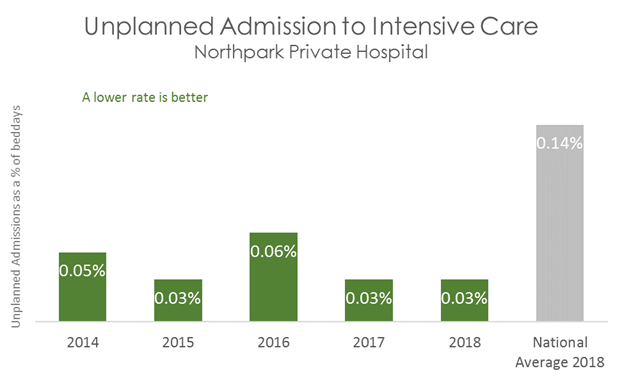 This graph shows that patients admitted to Northpark Private Hospital are less likely to have an unplanned admission to Intensive Care compared with patients in other Australian hospitals.