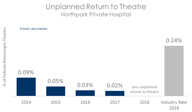 This graph shows that patients undergoing surgery at Northpark Private Hospital are less likely to have an unplanned return to theatre compared with patients in other Australian hospitals.