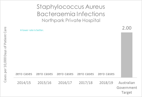 This graph shows that in recent years, the rate of SAB infections at Northpark Private Hospital has been well below the Australian government target.