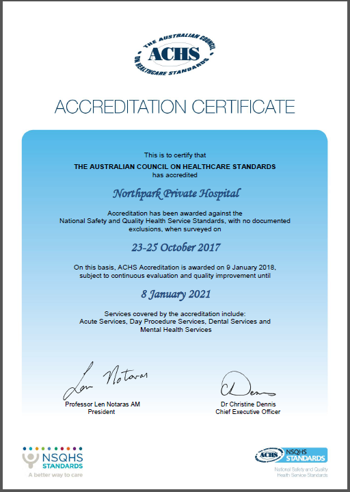 Northpark Private Hospital is fully accredited against the National Safety and Quality Health Service Standards (NSQHSS), a mandatory set of standards established by the Australian Government for all public and private hospitals.