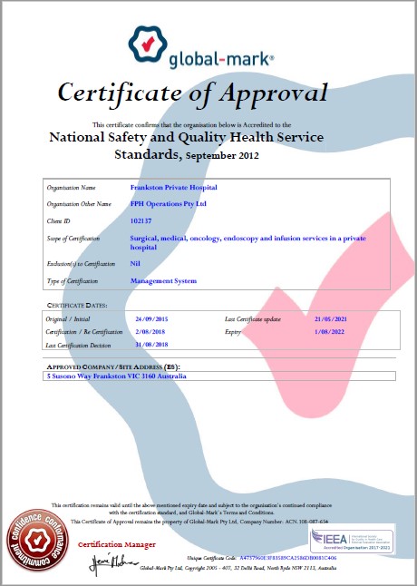 Frankston Private Hospital is fully accredited against the National Safety and Quality Health Service Standards, a mandatory set of standards established by the Australian Government for all public and private hospitals.